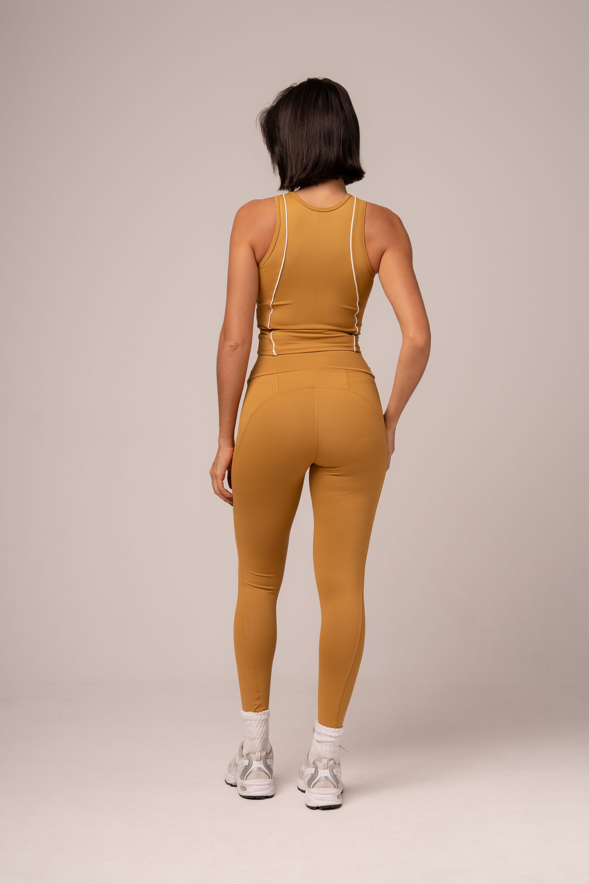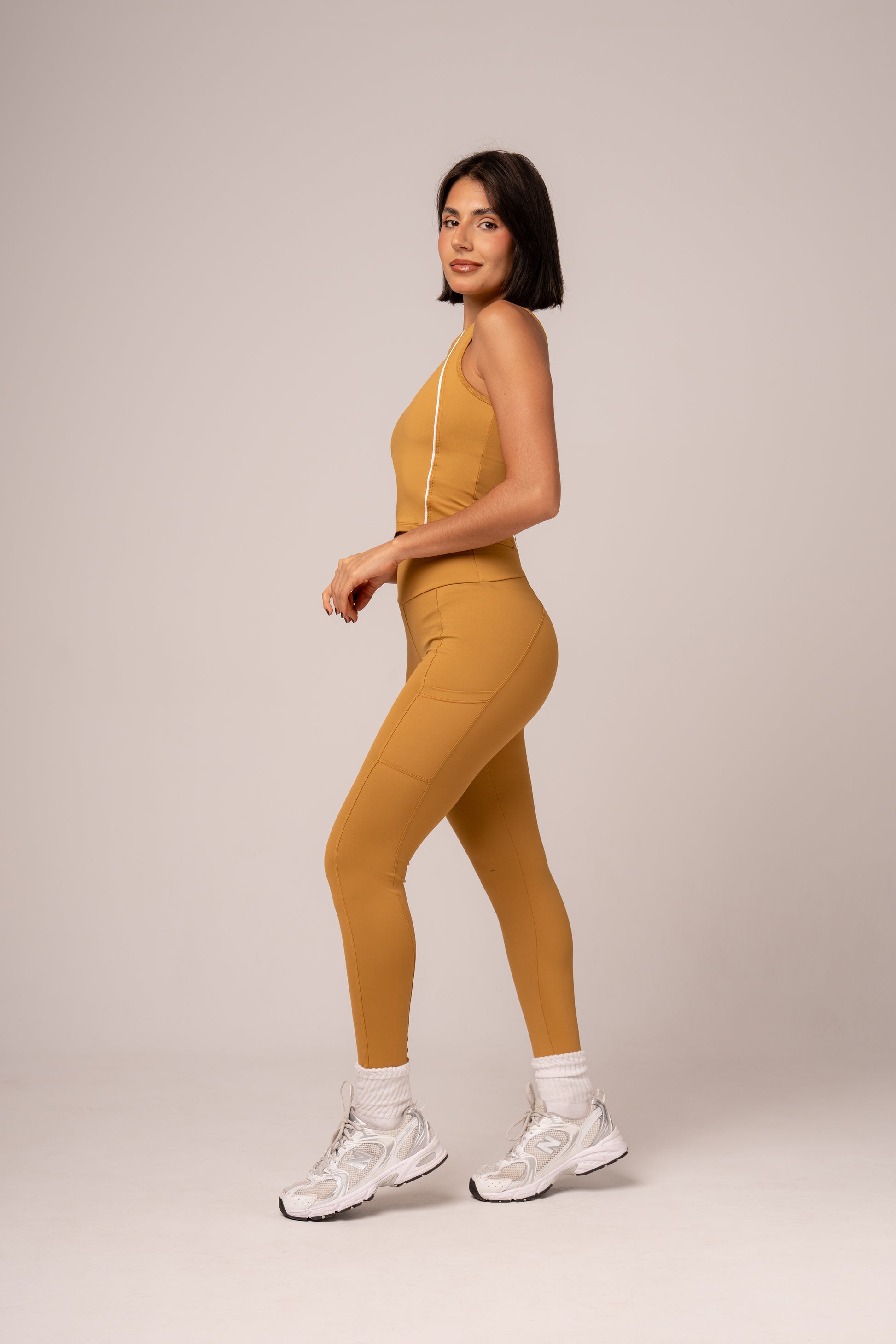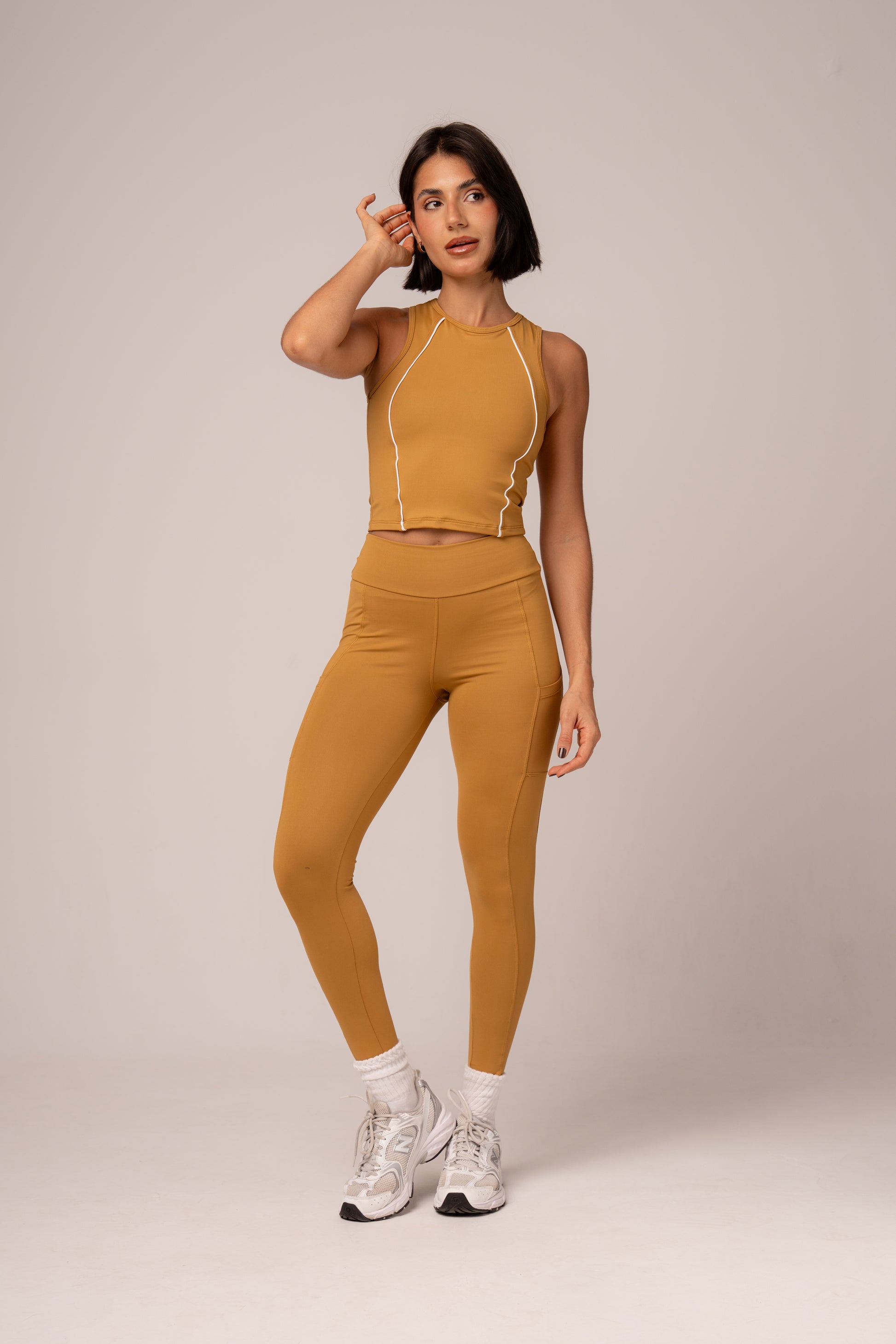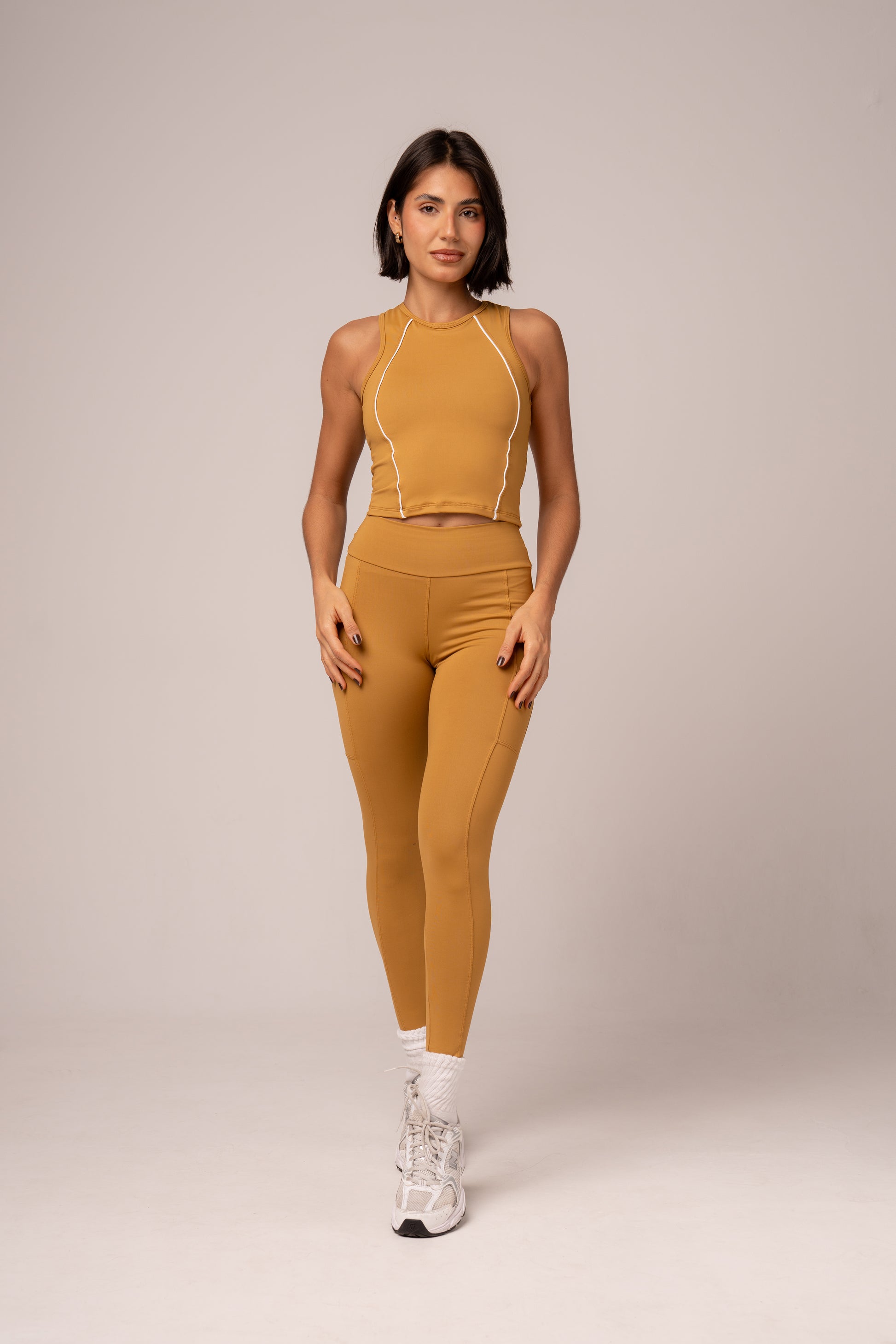 Conjunto Legging bolsos e Top Alongado Cosmo Mostarda