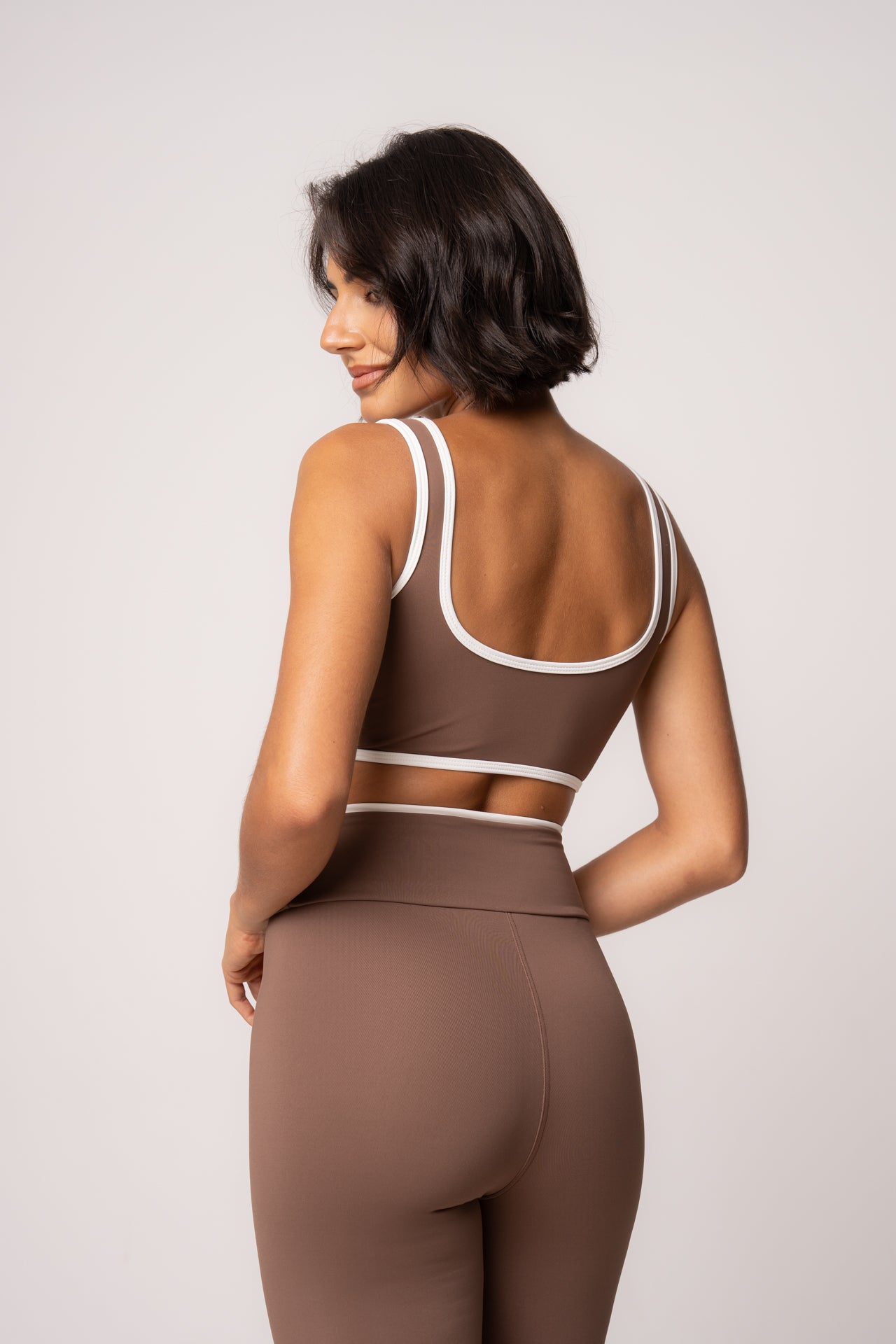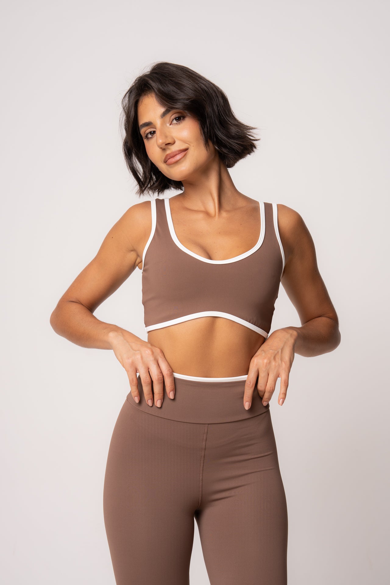 O Top Viés apresenta design anatômico e acabamento contrastante que valoriza a silhueta com sustentação e elegância. Já a Legging Cós Dupla Face modela sem apertar, com caimento impecável e versatilidade para compor diferentes looks.