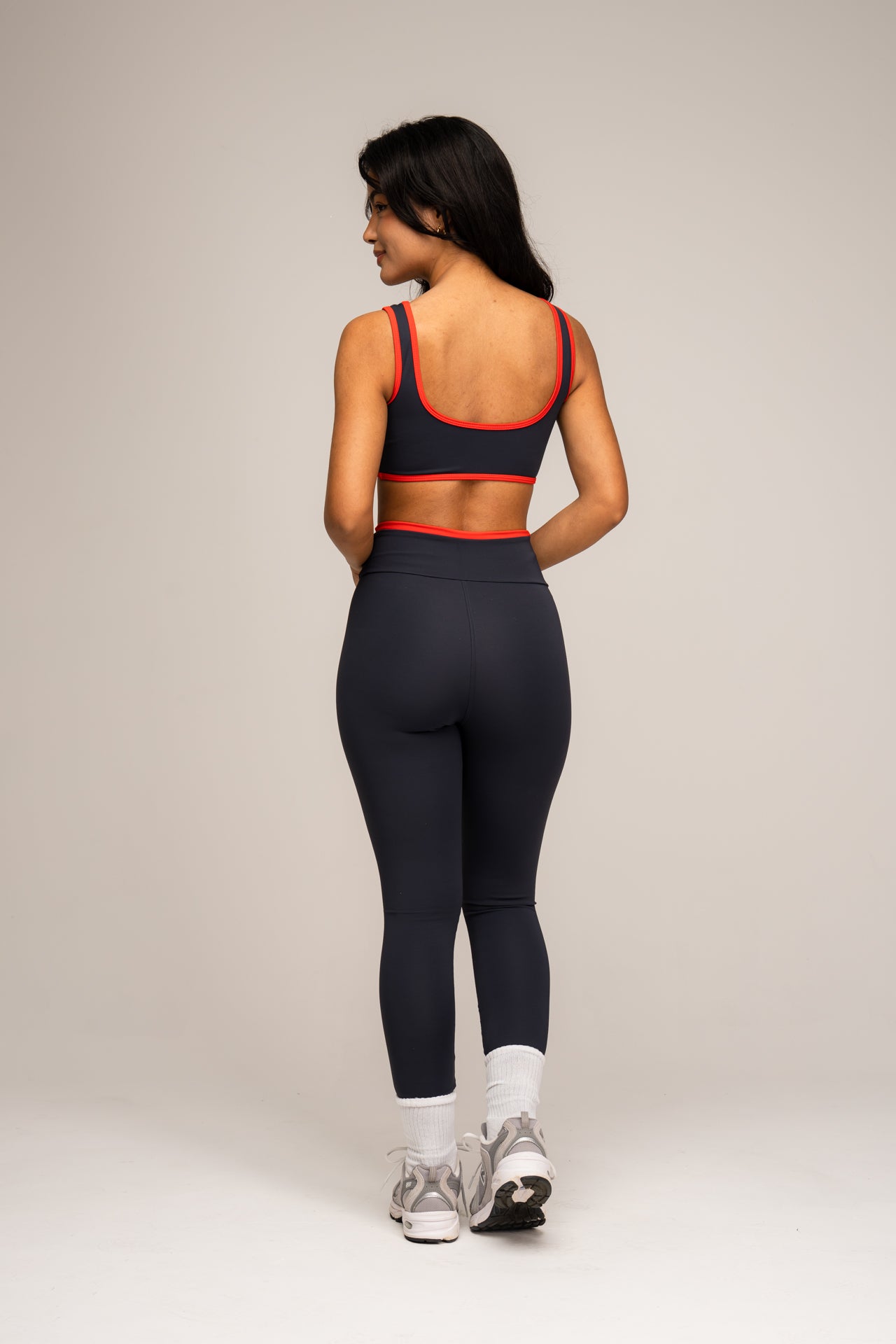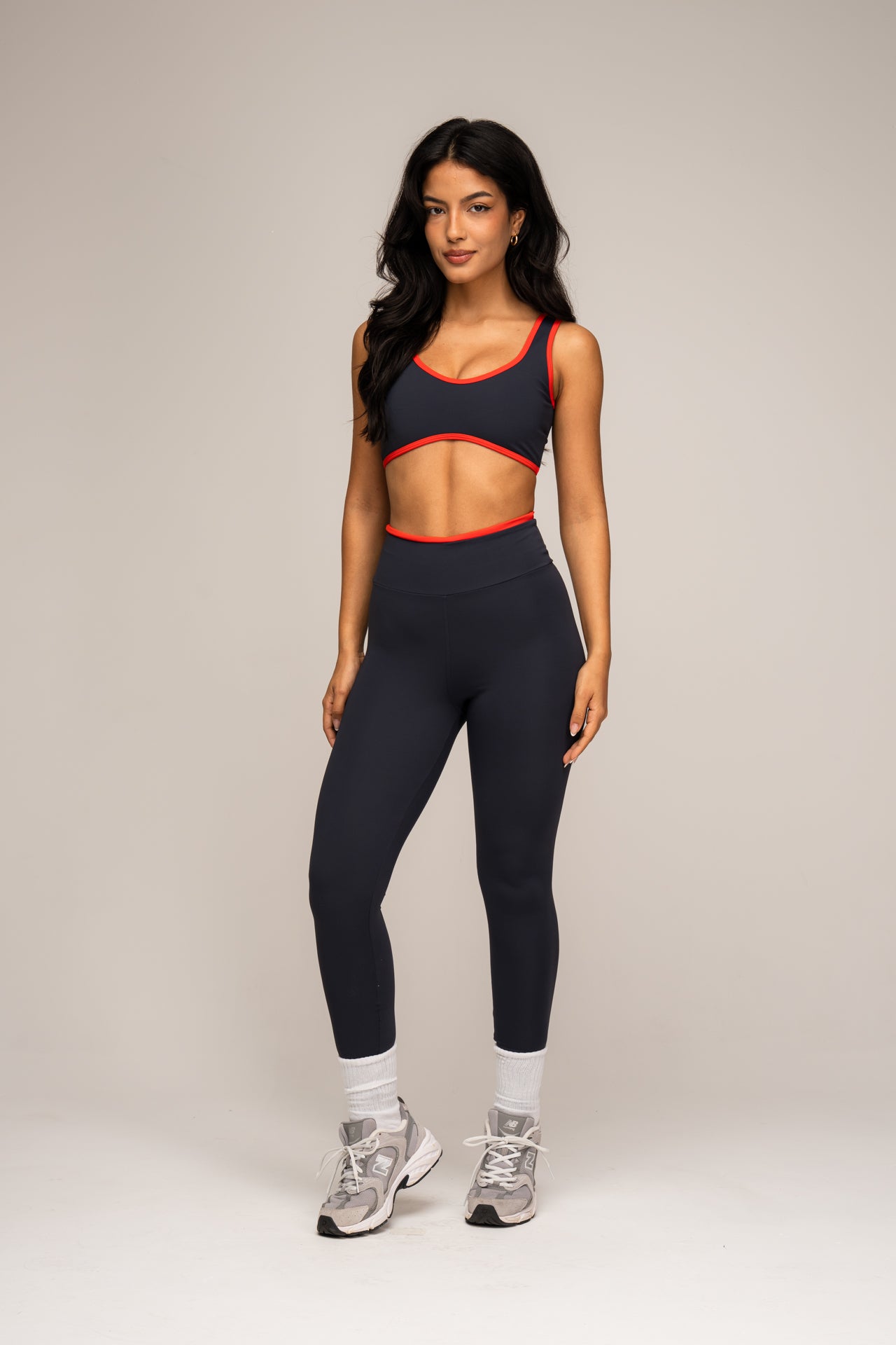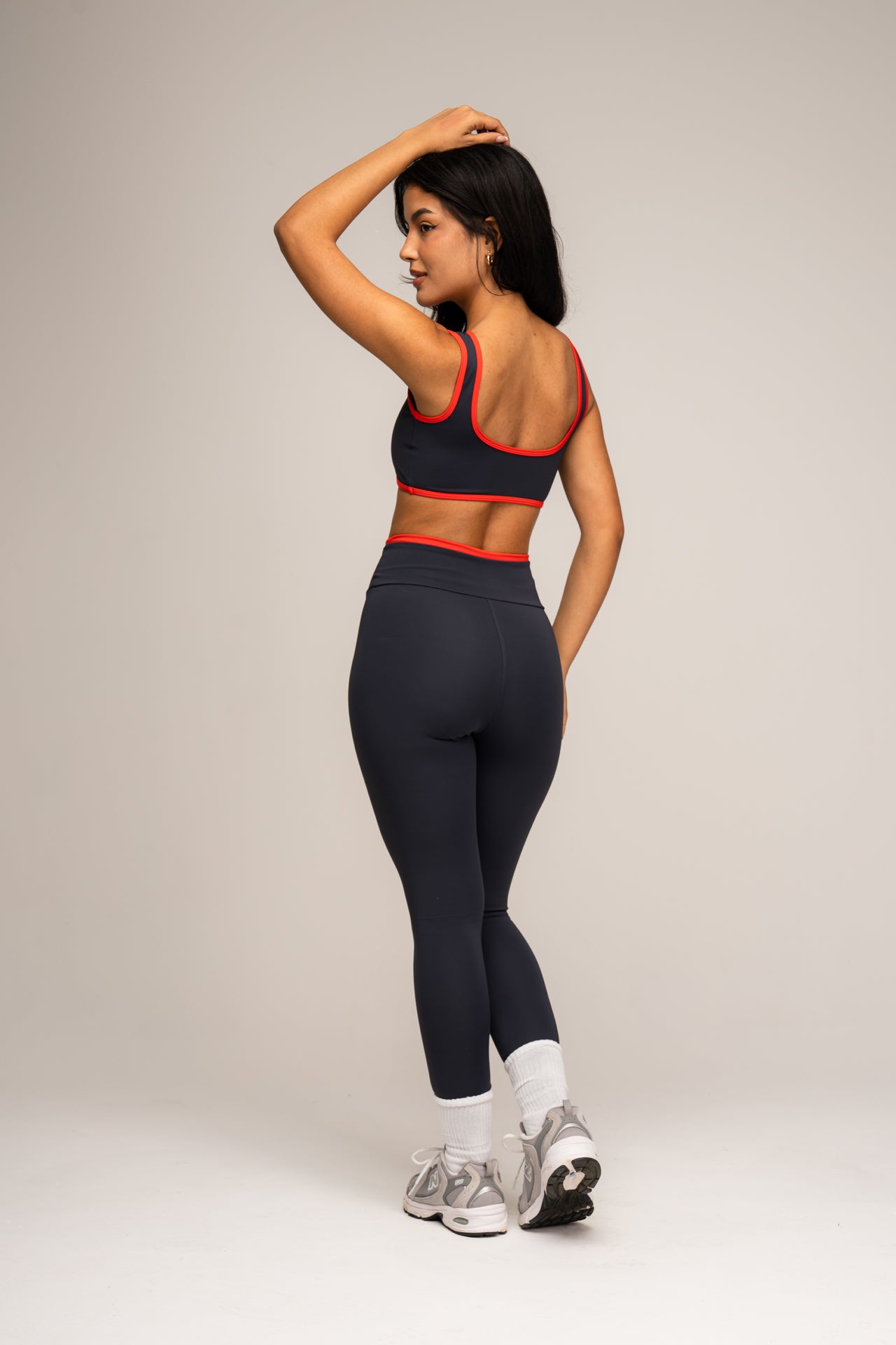 O Top Viés apresenta design anatômico e acabamento contrastante que valoriza a silhueta com sustentação e elegância. Já a Legging Cós Dupla Face modela sem apertar, com caimento impecável e versatilidade para compor diferentes looks.